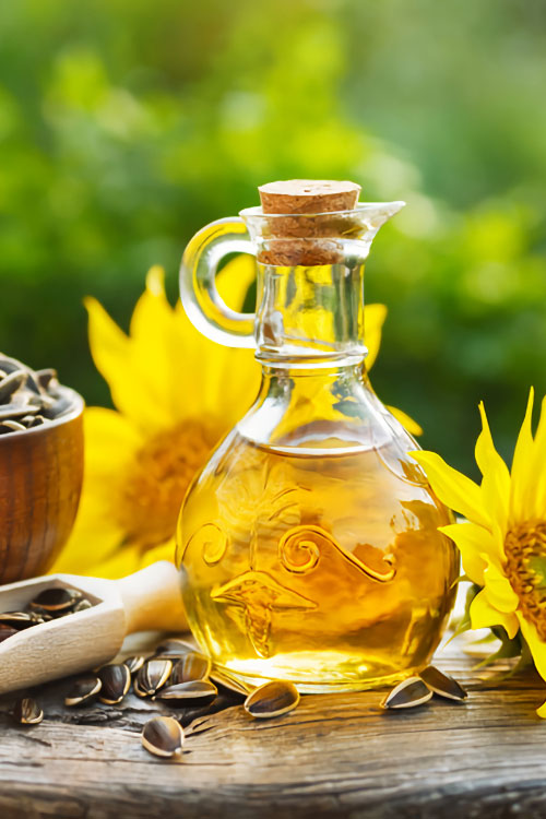 Sunflower oil is primarily composed of linoleic acid [polyunsaturated] and oleic acid [monounsaturated] fats. The oil contains a large amount of vitamin E.