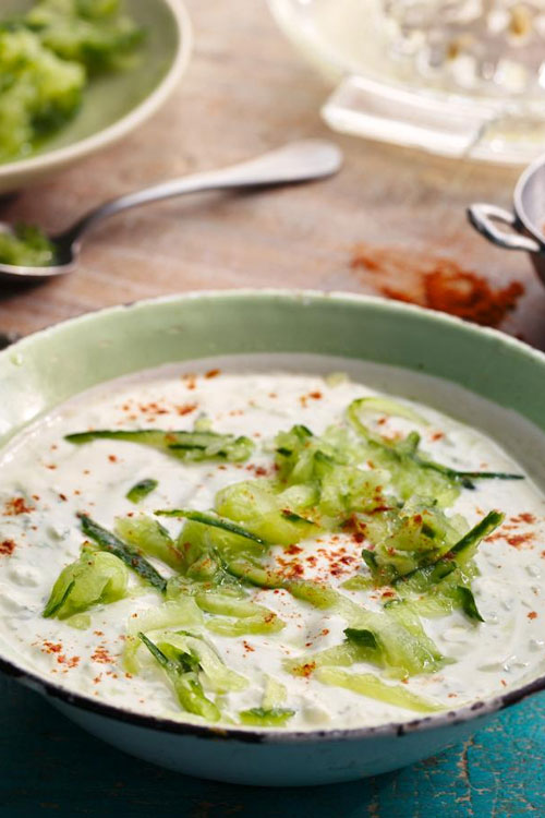 Combine the yoghurt, cucumber, lemon juice and garlic. Add a dash of olive oil and sprinkle with paprika.
