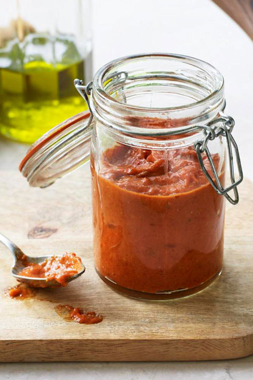 When the harissa is ready, transfer it to a sterilised jar, leaving a little space at the top of the jar. Pour in olive oil to cover the harissa (the oil acts as a preservative). Seal the jar and store in the fridge for up to a month.