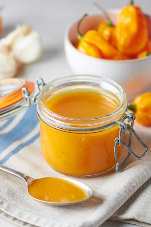 Make this sauce a vibrant yellow colour instead of the traditional red, which can be achieved with yellow devil’s tongue, habanero or scotch bonnet chillies. Of course, if you can’t get yellow chillies this works just as well with the more widely available red varieties.