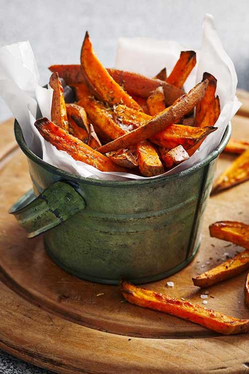 These crispy air fryer sweet potato fries have less fat and more vitamins than regular potato fries. Great with vegan and vegetarian bakes and burgers, or with chicken or fish dishes.