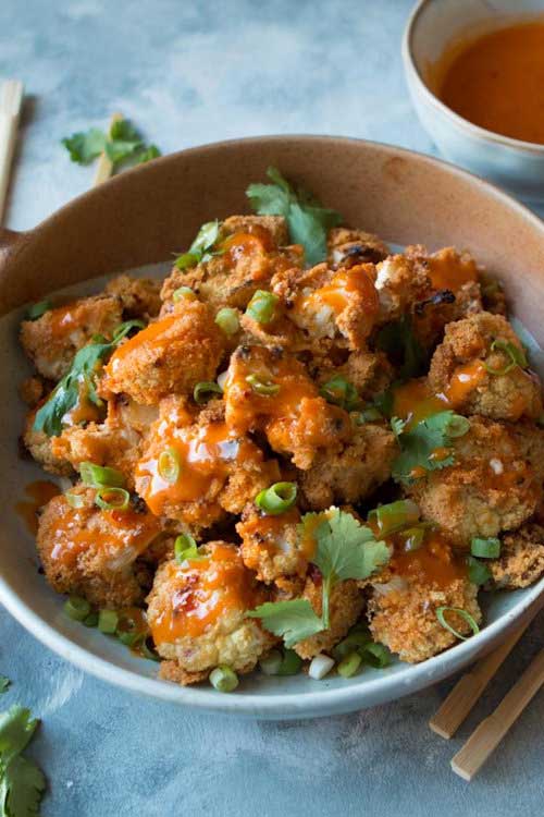 To serve, drizzle the bang bang sauce over the cauliflower and scatter over the red chilli and spring onions.