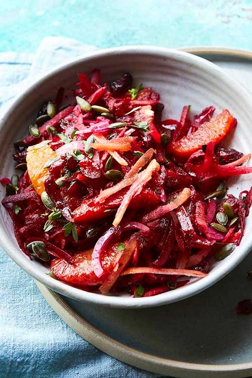 Simple, zesty and incredibly versatile – pop any of the listed ingredients you have at home into this carrot and beetroot slaw, or add whatever else you think would work. This is great with oily fish like mackerel.