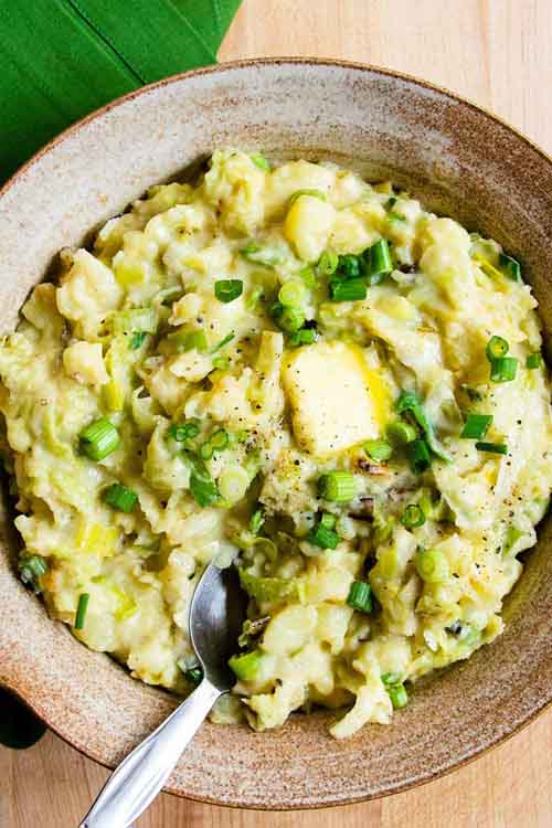 Add the remainder of the butter to the hot pan.Turn the potato mixture on to the pan and spread it out. Fry gently for a minute, remove and serve in bowls as a side dish with a knob of butter.