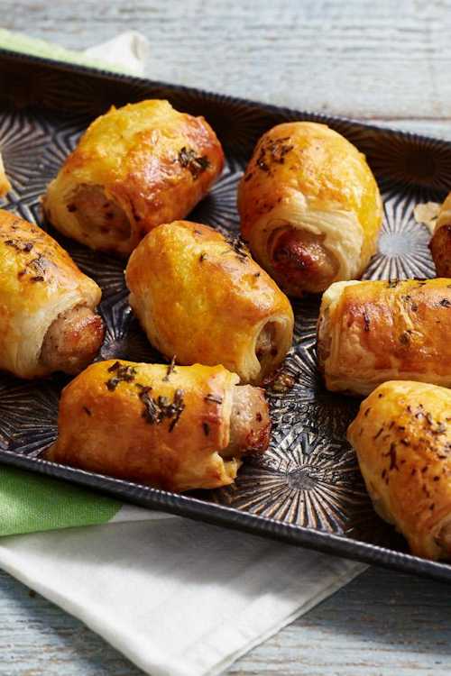Instead of thyme leaves, add chopped sage, parsley or rosemary. To guarantee your sausage does not escape its roll during cooking, the sausage ‘skin’ can be slipped off before encasing it in pastry.