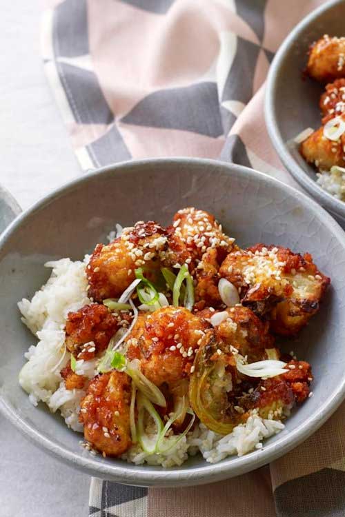 Crispy cauliflower florets coated with a Korean-inspired, sticky, rich, spicy sauce.