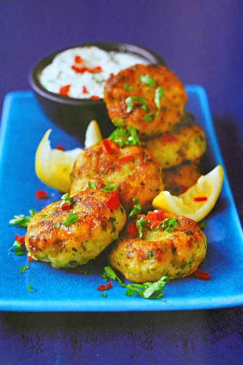 These crab cakes originate from the southern coast of Western India and here they are mixed with a firm white fish to give a spicy, flavoursome cake that is a great starter or could make a light lunch when served with a salad.