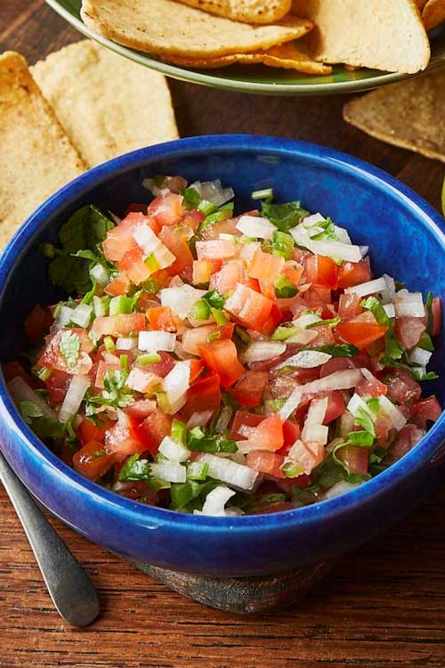 This fresh tomato salsa – known as pico de gallo in Mexico – is delicious as a side dish, a topping for tacos, or a dip to serve with tortilla chips. When made with red tomatoes, white onion, coriander and green chilli, it is sometimes called ‘salsa mexicana’ or ‘salsa bandera’, because it has the colours of the Mexican flag.