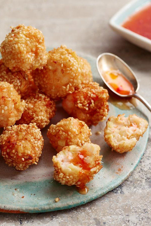 To make the balls, shape spoonfuls of the prawn filling into 18 balls with lightly wetted hands. Put the sesame seeds in a bowl. Roll each prawn ball in the seeds to coat and transfer to a plate.