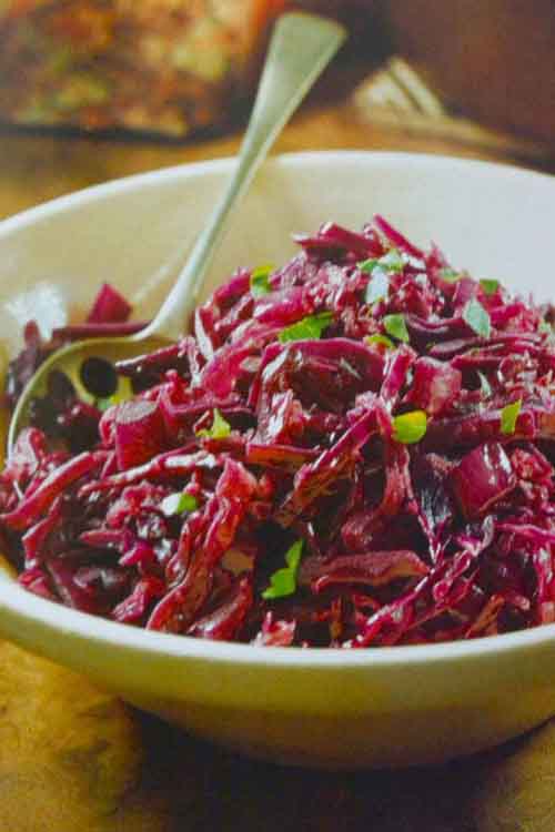 Layer the shredded cabbage in a large ovenproof dish with the onions, apples, spices, sugar, and with salt and freshly ground black pepper. Pour over the vinegar and add the diced butter.