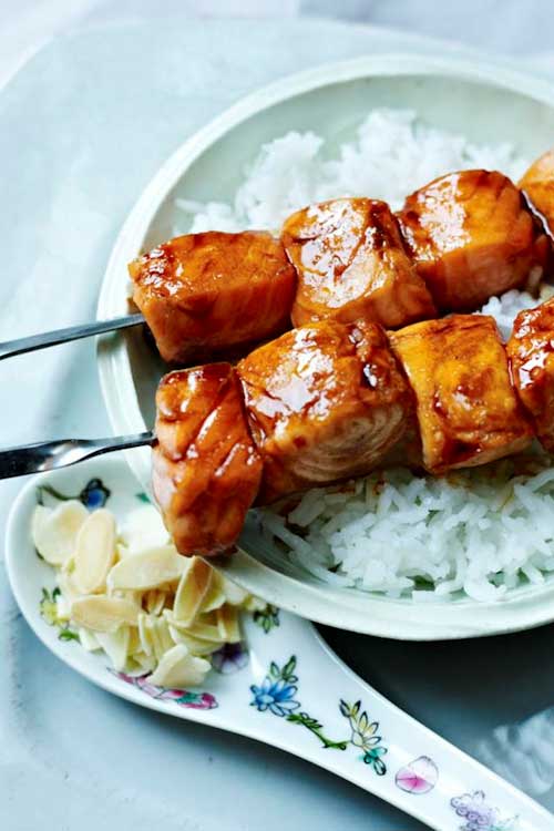 Salmon kebabs in a sticky soy glaze are great for barbecues and make a welcome change from the usual bangers and burgers.