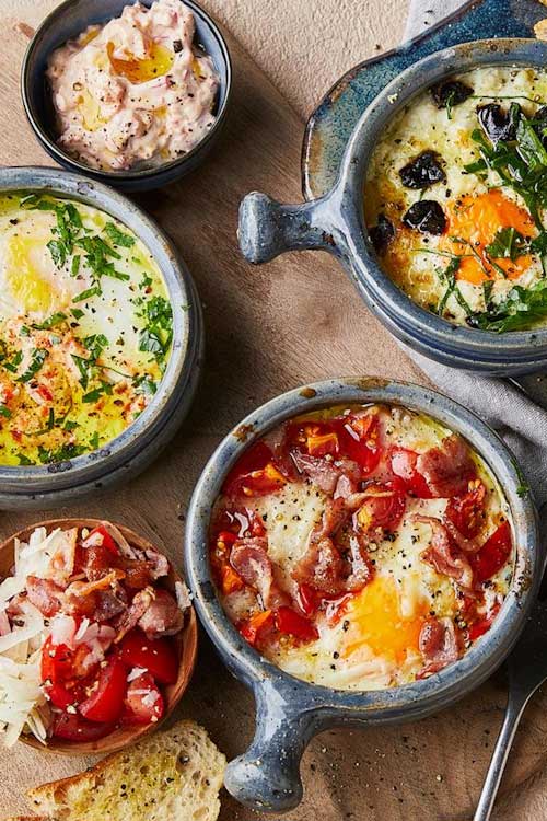 If using a topping, add your chosen ingredients now, dividing the quantities listed above equally between the four ramekins. Each topping recipe is enough for four eggs.