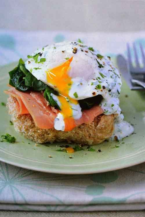 This classic brunch dish of poached eggs served on wilted spinach leaves with slices of ham make an indulgent start to a lazy Sunday.