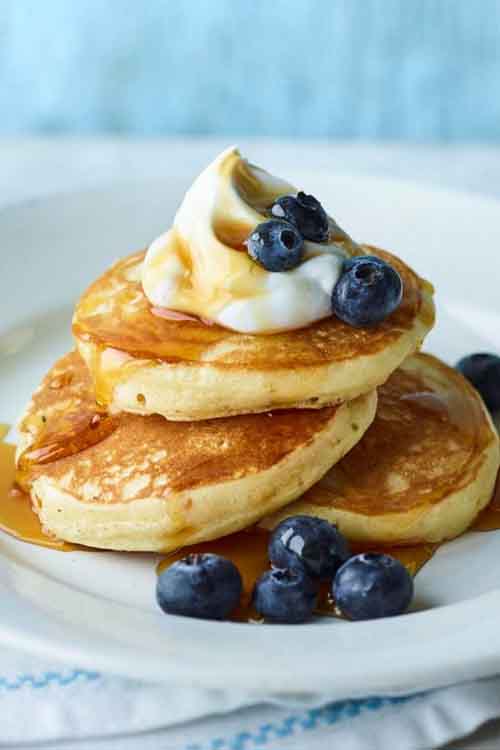 Transfer to a plate and keep warm in a single layer (so they don’t get squashed) on a baking tray in a low oven while the rest of the pancakes are cooked in exactly the same way. Serve with your preferred toppings.