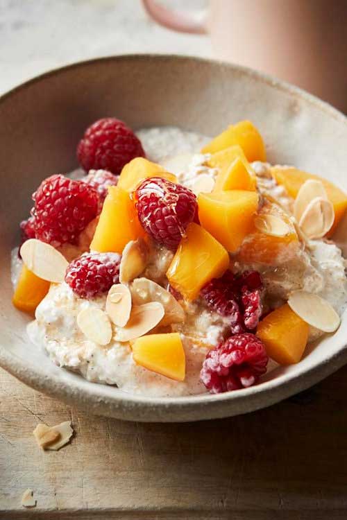 In the morning, stir a little water into the oat mixture to loosen. Stir in half of the peaches and raspberries and transfer to a cereal bowl.