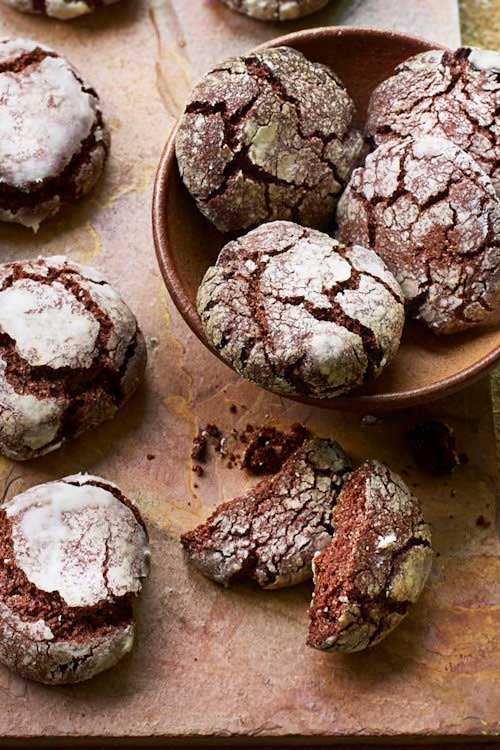 Shape tablespoons of the dough into balls and roll each one in the icing sugar. Place the balls on the baking tray and lightly press each cookie (do not flatten completely) leaving at least 5cm between each. Bake for 10–13 minutes, or until the cookies are cracked and firm on the outside.