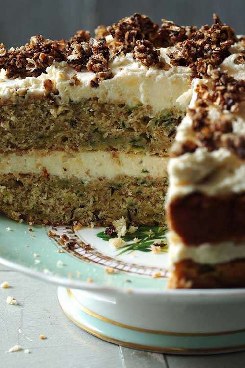 A tender courgette cake filled with apple-flavoured cream cheese and topped with crunchy caramelised oats. Almost healthy!