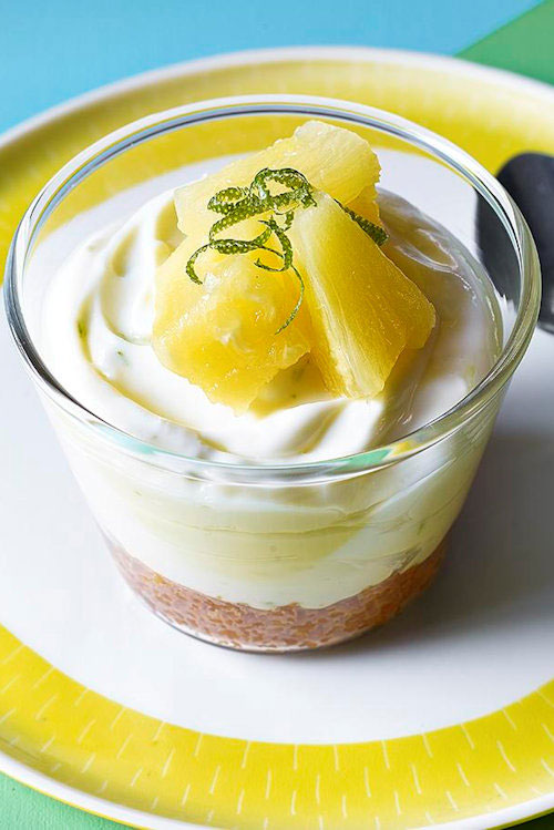 Spoon the creamy filling onto the biscuit base. Top with the pineapple chunks then place in the fridge for 30 minutes. Decorate with extra lime zest if you like.