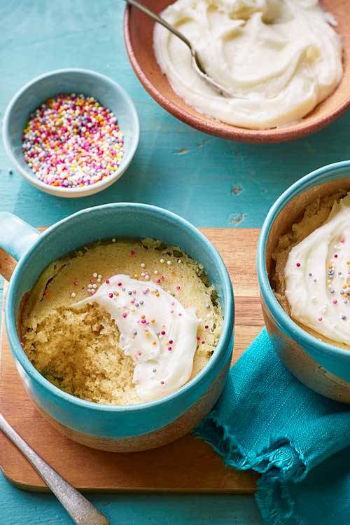 Serve warm in the mug with ice cream, cake frosting or a dollop of jam or lemon curd.