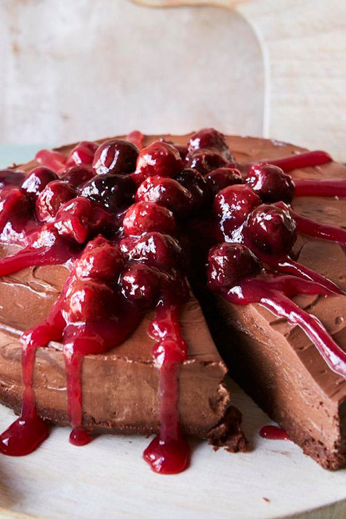 To serve, carefully remove the cheesecake from the tin, peel away the lining paper and put the cheesecake on a serving plate. Spoon the boozy cherry compôte (warm, or stirred to loosen if chilled) over the cheesecake, letting the syrup and fruit run down the sides.