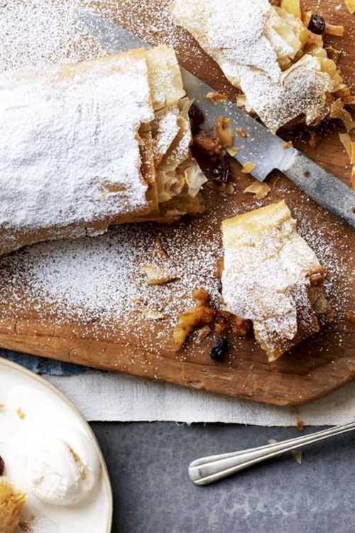 Mix the apples with the cinnamon, lemon zest and juice, sugar and raisins. In a small frying pan, melt 20g butter and fry the breadcrumbs until golden-brown, then add to the apple mixture.
