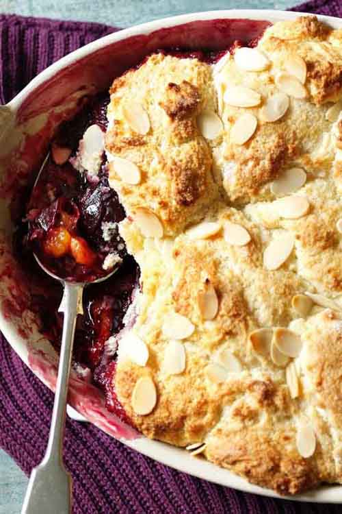 Bake in the oven for 30-35 minutes until golden and bubbling, covering it loosely with a sheet of foil if it is browning a little too quickly. It is done when a skewer, pushed into the middle of the cobbler topping, comes away clean. Leave to cool briefly before serving with some custard, double cream or crème fraîche.