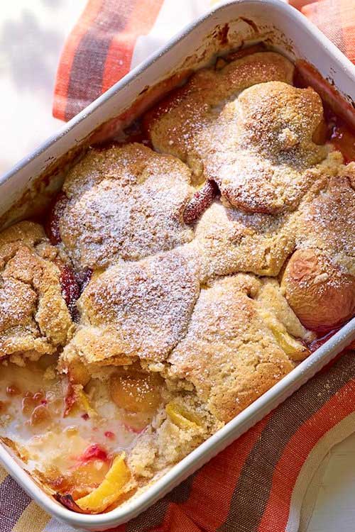 A cobbler topping is somewhere between a crumble, scone and dumpling. Cook in a wide, shallow baking dish rather than something narrow and deep to make sure your ‘cobbles’ cook through but stay light and fluffy.
