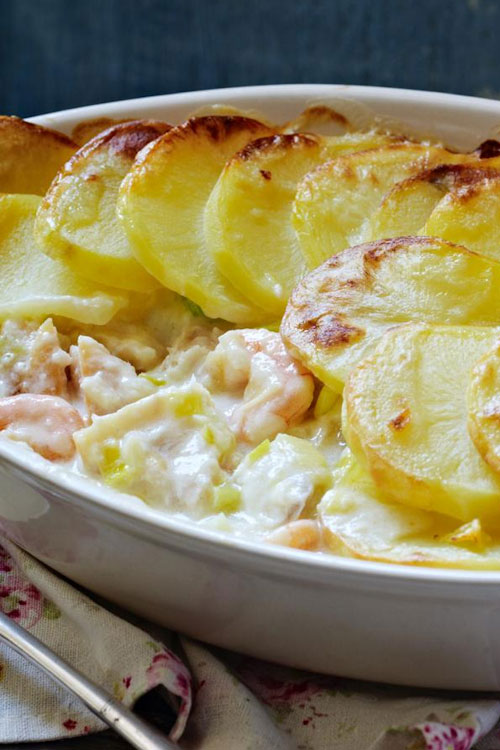 Place the dish on a baking sheet and bake for 35-40 minutes, until the potatoes are golden and the fish is completely cooked through.