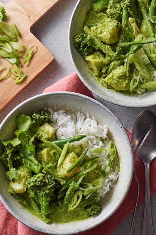 A ridiculously quick and simple Thai green curry with plenty of veg and flaky white fish. Serve with steamed rice.