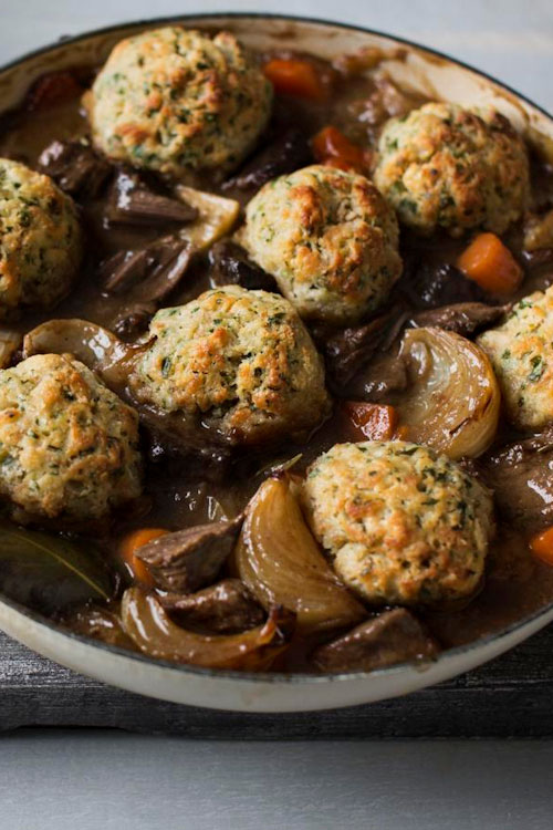 Put the lid on the casserole and return it to the oven for a further 20 minutes, or until the dumplings have expanded.