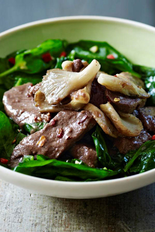 Spoon the oyster mushrooms over the beef and serve.