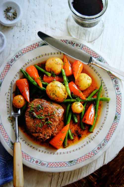 Place the beef, vegetables, garlic cloves, peppercorn, vinegar, stock and dill into the slow cooker pot and stir well.
