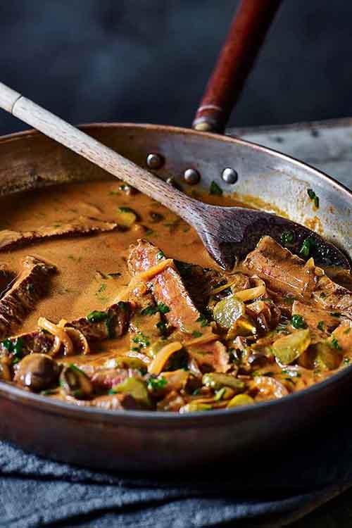 This classic creamy beef stroganoff recipe is made with mushrooms, smoked paprika and slices of pan-fried rump steak.