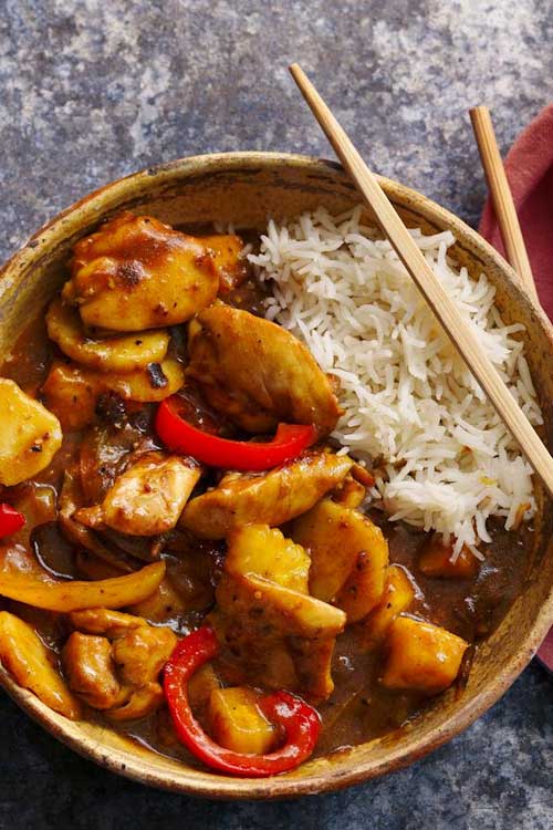 A crowd-pleasing easy chicken curry, packed with Chinese flavours. The sauce is really easy using two popular spice blends: curry powder and five-spice. Serve over rice.