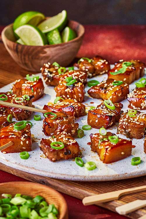 These bite-sized cubes of pork belly are coated in a sticky glaze of lime, sesame seeds and soy sauce.