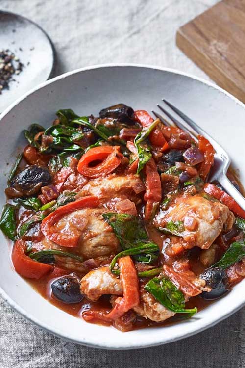 This simple one-pot healthy chicken casserole has a rich and spicy tomato sauce studded with black olives, with spinach stirred in just before serving.