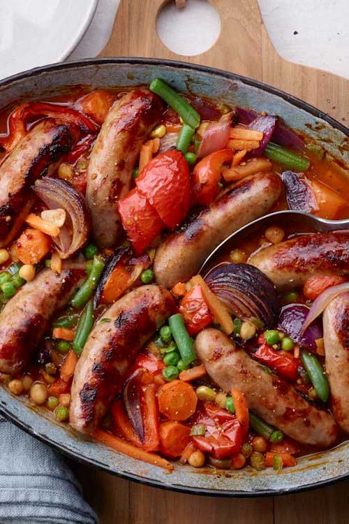 Put the peppers, carrots, onions and garlic into a deep baking dish and roast for 20 minutes. Add the sausages and roast for a further 10 minutes.