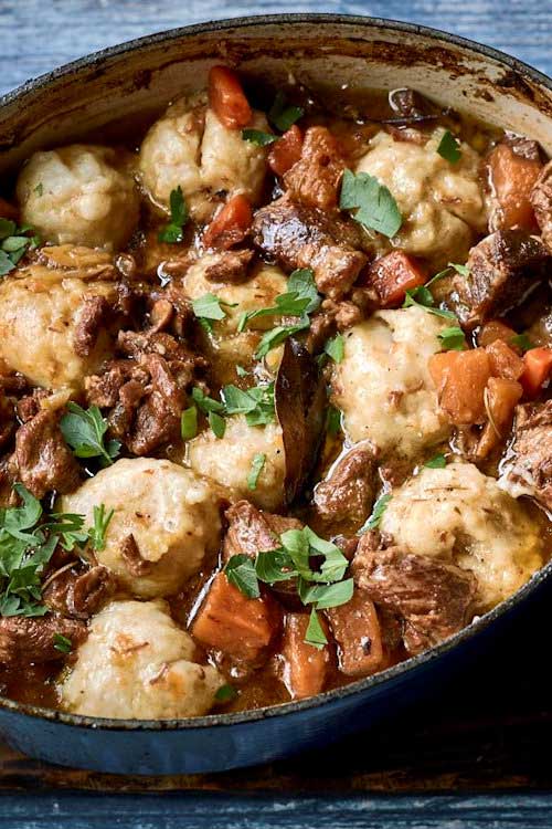When the lamb stew is ready, place the dumplings on the top of the stew and put the lid back on. Return the stew to the oven for 10 minutes or until the dumplings are fluffy and cooked through. (Alternatively, if you are short of space in your casserole dish, place 500ml lamb stock into a separate pan and bring to a simmer. Add the dumplings and simmer for 6–8 minutes. Discard the stock when the dumplings are cooked and set them aside to rest for a minute.)