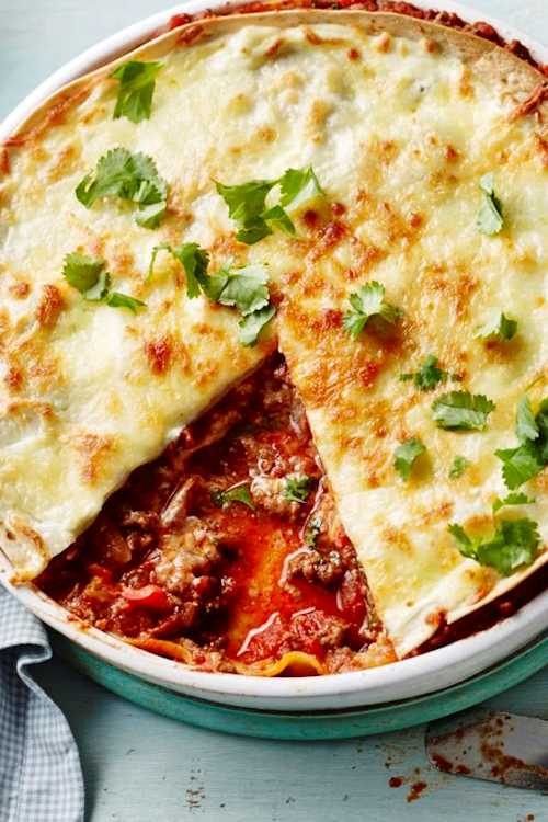 This all-in-one dish is so quick to make. Think Mexican lasagne using ready-made tortillas instead of sheets of pasta. Utterly delicious and very moreish!