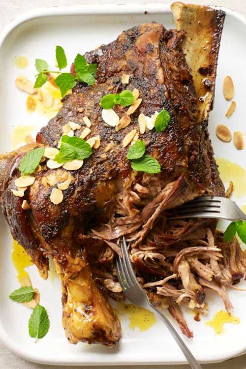 When the lamb has rested, use two forks to shred the meat. Garnish the meat with chopped mint leaves and flaked almonds.