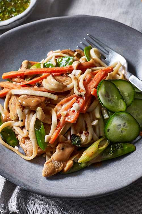 Make the spicy peanut sauce and sweet chilli dressing in advance to get ahead on this delicious chicken stir-fry.