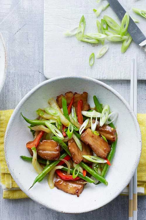 It's worth taking the time to poach and marinate the pork for this delicious stir-fry. Once that's done it's ready in minutes.