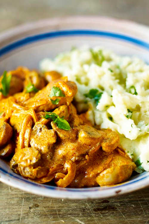 Put the butter in the pan, add the onions and cook over a low heat until the onions are really tender. Sprinkle in the paprika and stir in the mushrooms. Turn up the heat and toss for a minute.