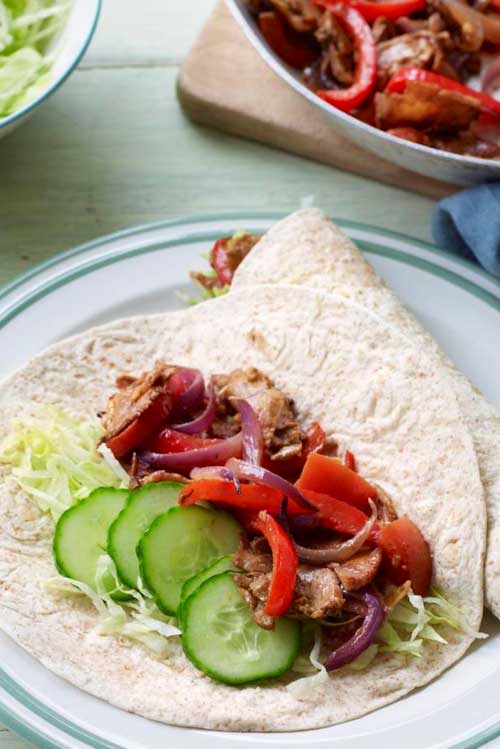 Fry up some cooked pork with peppers and spices to fill a tasty wrap, with salad and soured cream. A fun meal for four that makes leftovers go further.
