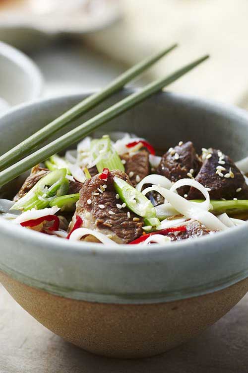 Serve the meat and juice with rice noodles, chopped spring onions, red chilis, fresh coriander and toasted sesame seeds.