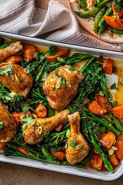 Add the glaze ingredients to a bowl and mix well to combine. Pour half of the glaze over the top of the chicken and sweet potato chunks, turning them over to make sure every piece has a good coating of glaze. Save the rest of the glaze in the bowl for later.