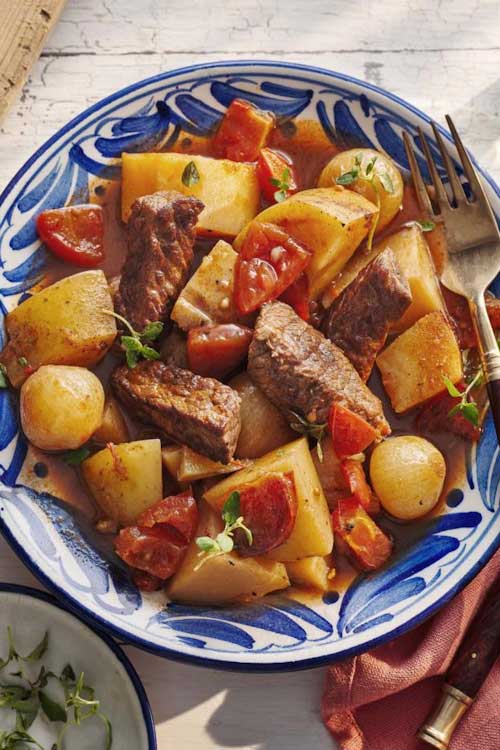 Greek comfort food! Stifado is a beef casserole cooked with baby onions in a tomato sauce. It can also be made with rabbit or pork. This version includes potatoes, for a one-pot supper.
