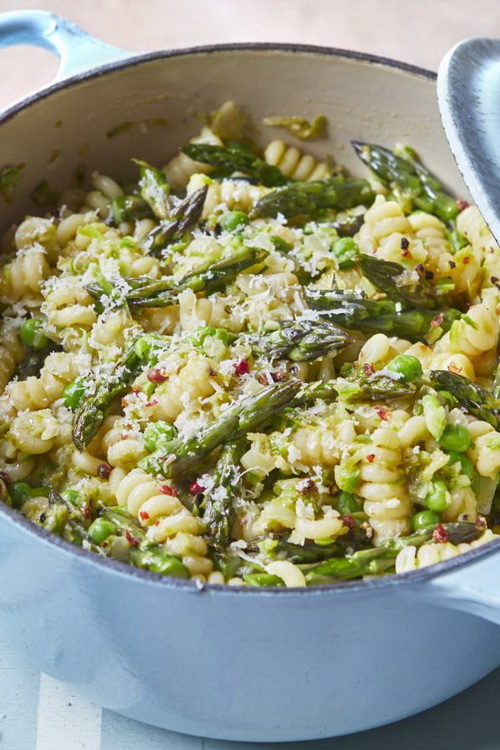 Return to the frying pan and gently fold in the pasta, asparagus tips and peas. Pour in enough of the reserved cooking water to make a rich sauce.