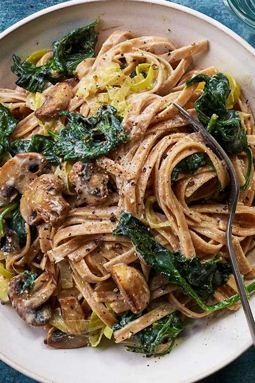 This vegan mushroom and spinach pasta makes a healthy, super-satisfying dinner for two. It uses silken tofu to give the sauce a wonderful creaminess and extra protein.