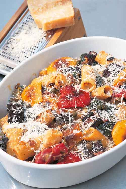 Next drain the rigatoni in a colander, transfer it to a large mixing bowl and combine it with the roasted vegetables, olives, anchovies, capers and the sauce. At this point turn the heat down to 200°C/Fan 180°C/Gas 6 (leaving the door open to cool it down a bit quicker). Now spoon one-third of the mixture into a shallow baking dish, sprinkle half the mozarella on that, followed by another third of the mixture and then the remaining mozerella. Finally spoon the last third of the mixture, with one heaped tablespoon of parmesan sprinkled on top. Bake in the oven for another 6 minutes, and serve very hot with a leafy salad.